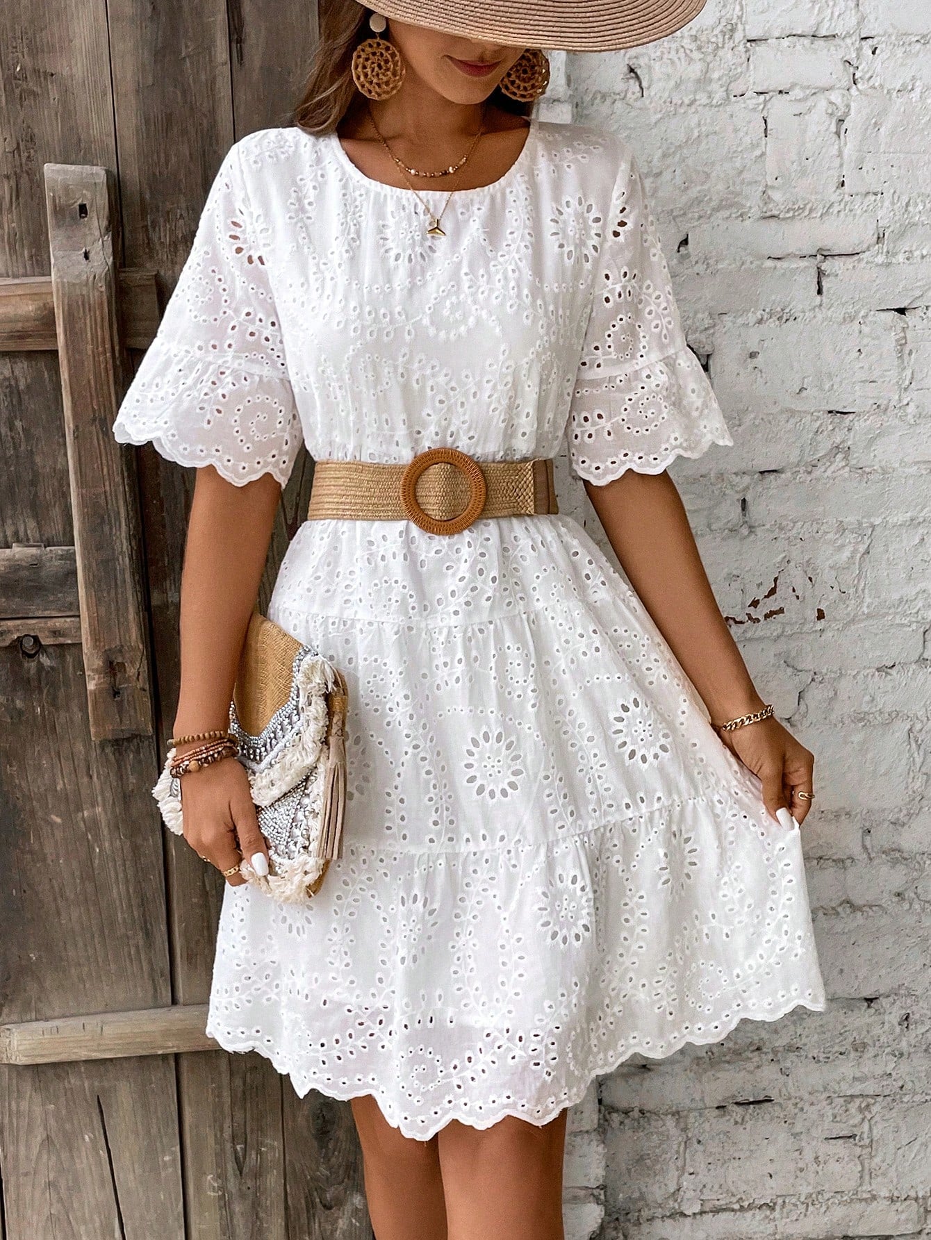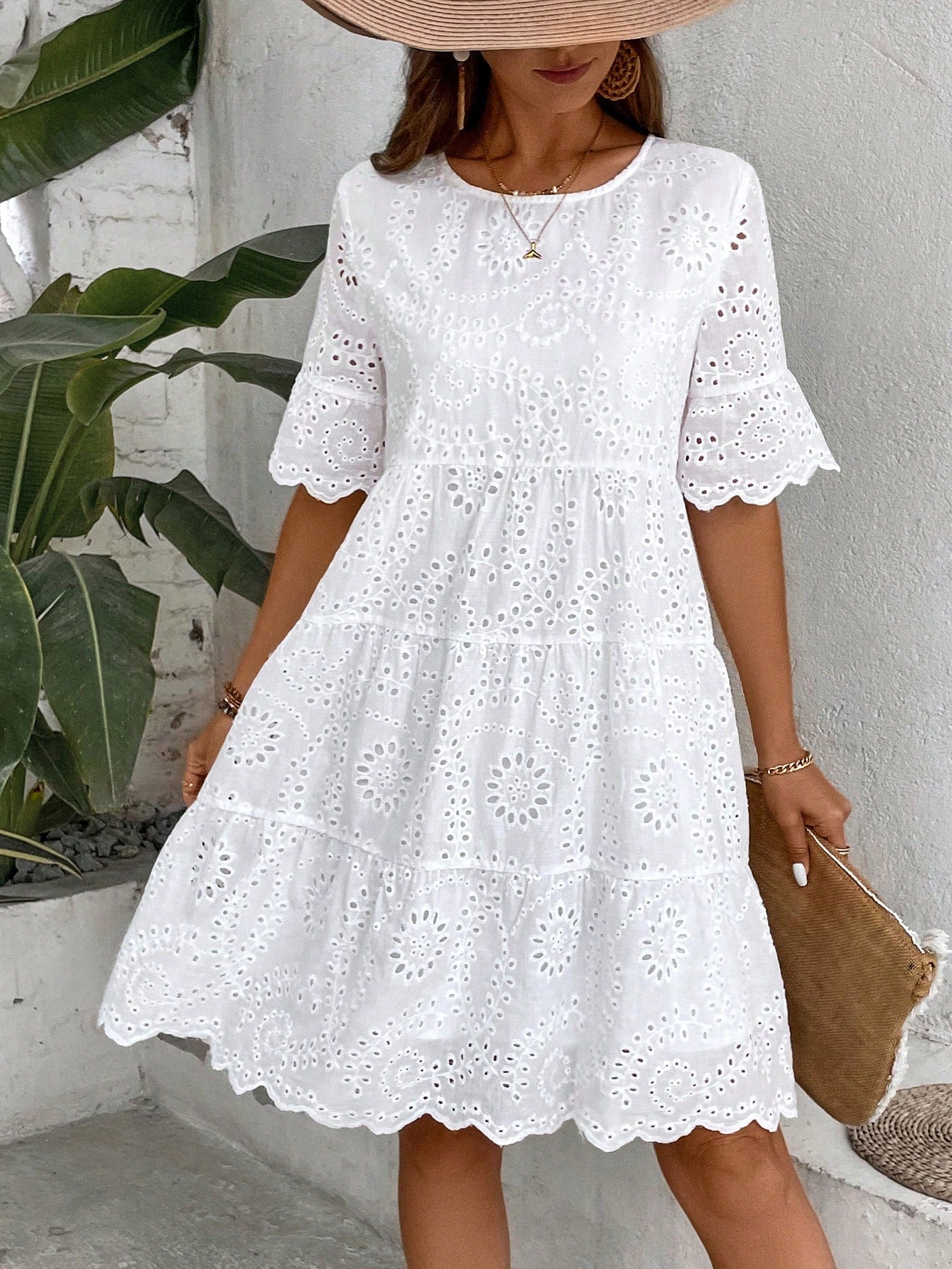 Elena- Abito bianco ricamato in cotone con maniche a tre quarti