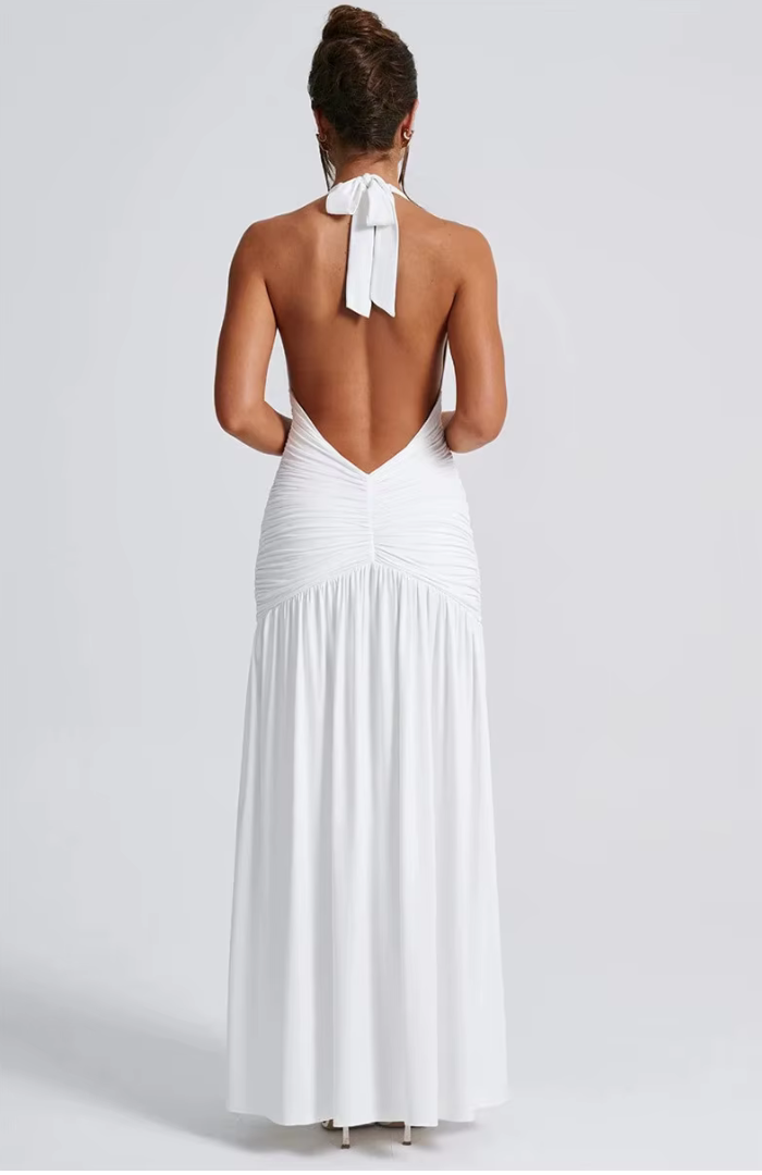 Lunaria è l'abito lungo che incarna la femminilità moderna in tutta la sua essenza. Con linee sinuose, una profonda scollatura a V e una schiena sensualmente scoperta, questo abito celebra ogni curva con grazia e carattere. Lo spacco laterale aggiunge un tocco intrigante che cattura ogni sguardo, rendendolo perfetto per serate indimenticabili, eventi esclusivi o cene romantiche.